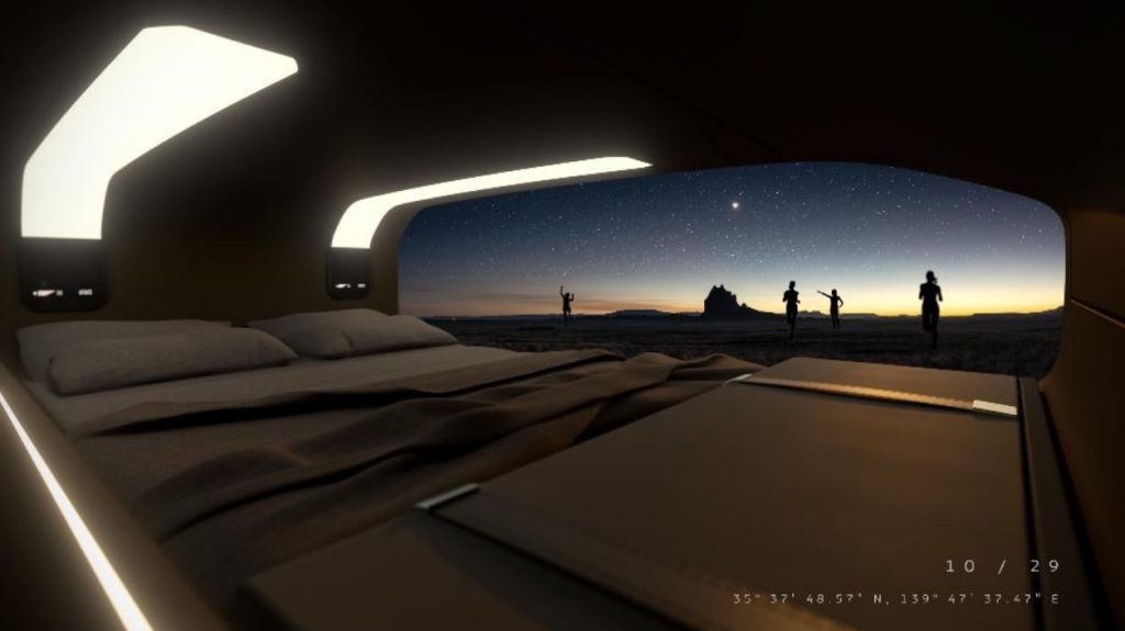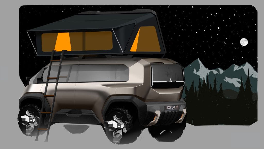 室内の比較的高い位置にベッドを配して、ルーフに載っているブラックの部分が開いて屋根から空が見えるとか、閉じればこのスペースが室内空間に余裕を持たせ、2段目のベッドでも快適に過ごせる仕様なのかと色々と想像されますが、2023年に三菱自動車のHPで掲載されているD:Xコンセプトのイラストに中に以下のような写真やイラストがありました。