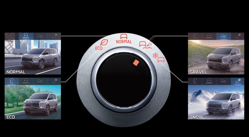 アウトランダーや新型デリカミニをご覧いただくと分かりますが、セレクターレバーの近くにあるあの丸いダイヤルですが、これを使いノーマルモードからSNOWやGRAVEL等に切り替えができます。これがいよいよデリカD:5の装備されます。
