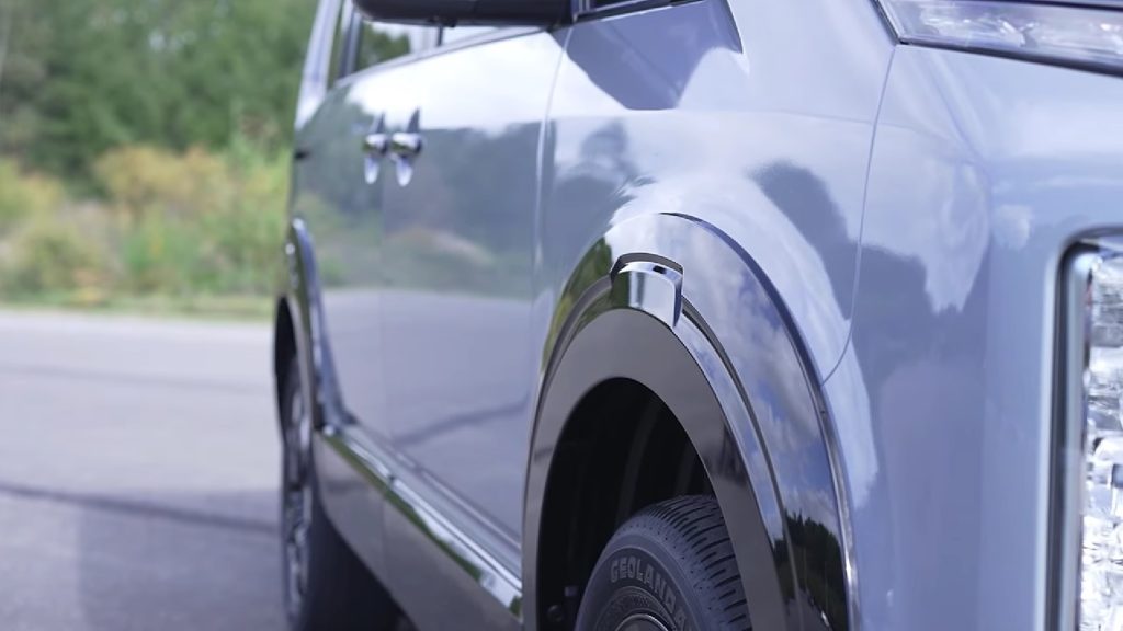 サイドビューで目立つのはなんといってもオーバーフェンダーです。今回10mmオーバーフェンダーが装着されていますが、オーバーフェンダーが装着されいるフロントフェンダー部分は素材や形状がオーバーフェンダーを装着する前提の造形のようで、現行モデルとは少し異なるようです。あと、メッキ部分だったサイドストライプも塗装されています。