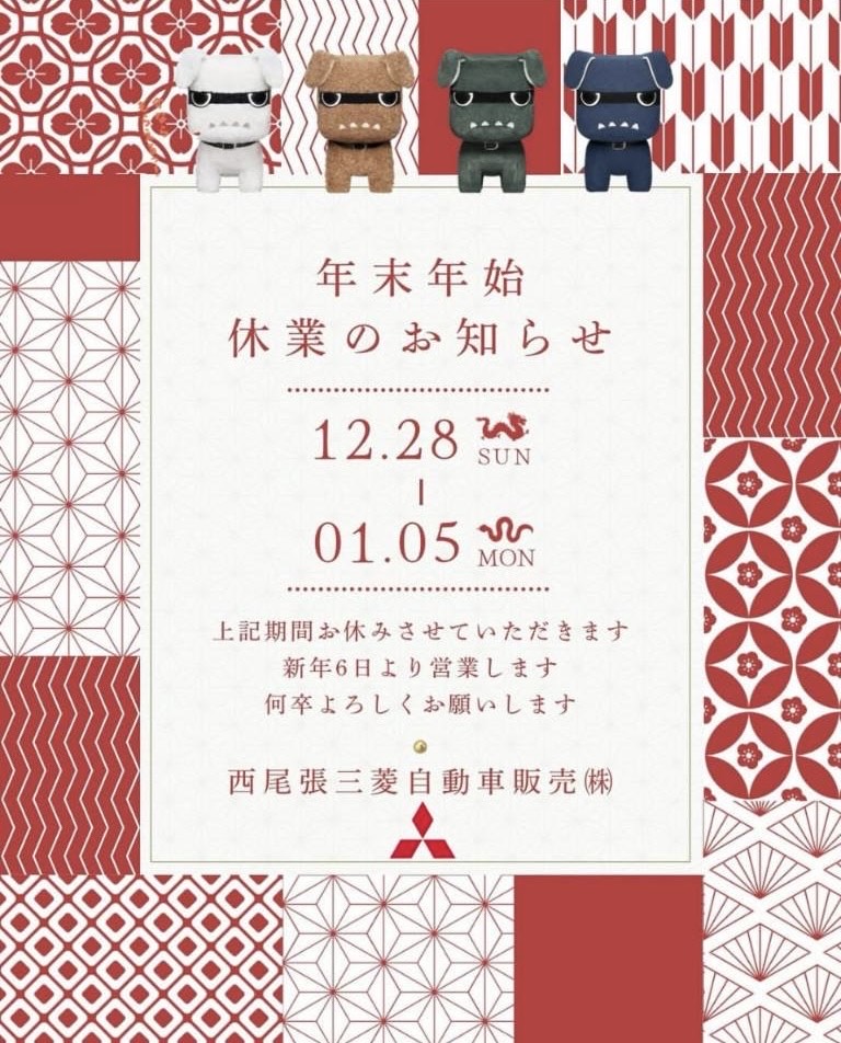 年末年始のお知らせ 2025年12月29日 最終更新日時 : 2025年12月29日 sun-auto 年末年始の休業のお知らせです。 西尾張三菱は12月28日から1月5日までお休みをいただきます。 初売りは1月6日からとなります。