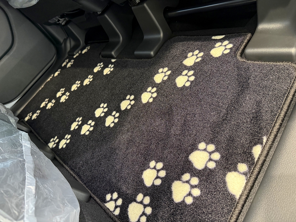 デリカミニの愛くるしい顔にオリジナルの足あと柄🐾マットをお選びいただきました。