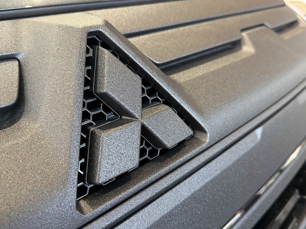 アイライン、フロントグリルをラプターライナーで塗装し、三菱純正オプションのブラックアウトフロントロアバンパーを装着いただきました。
